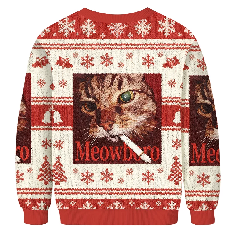 Red “Meowlboro” Smoking Cat Meme Ugly Christmas Sweatshirt Funny Parody Holiday Jumper